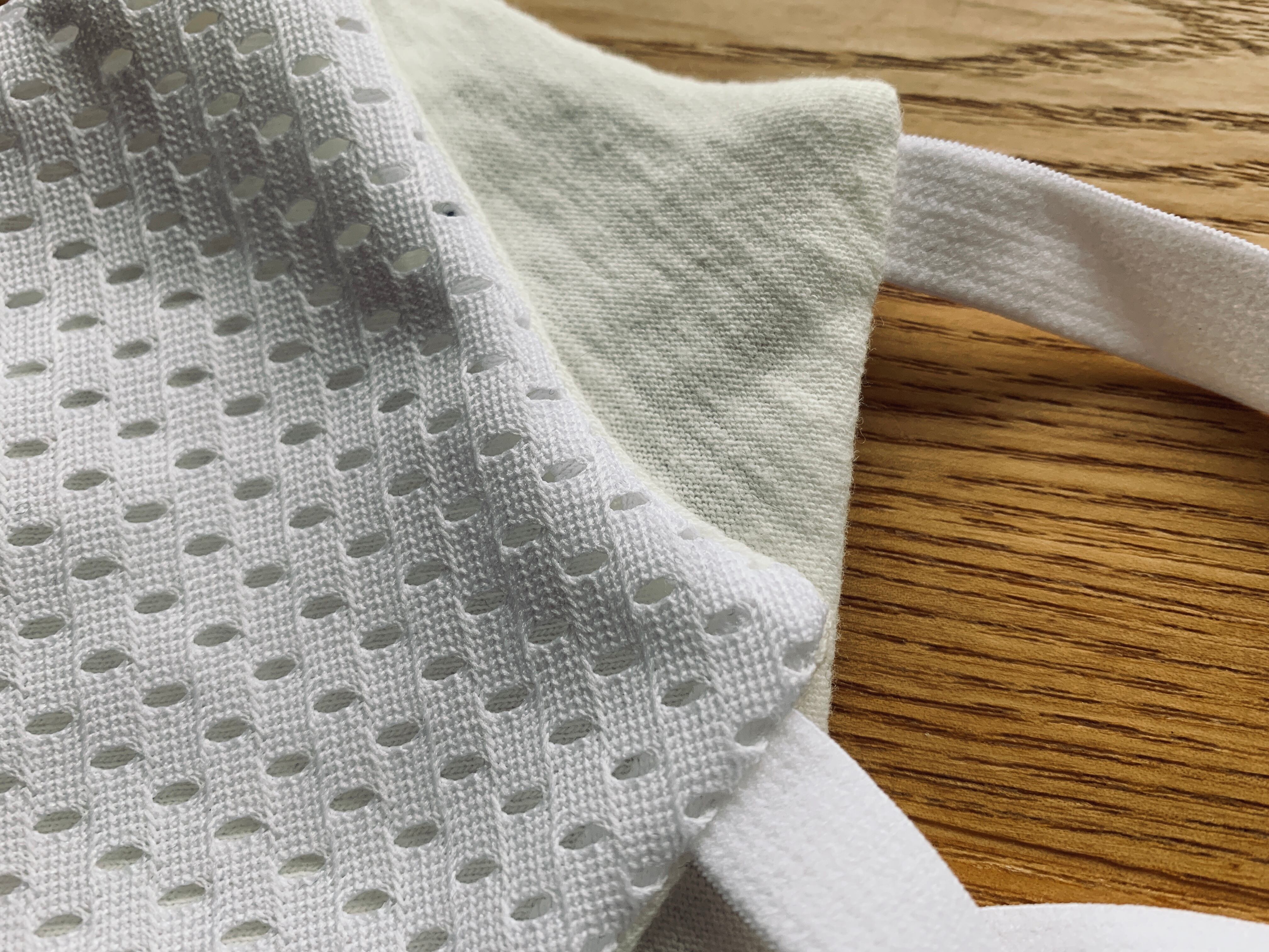 通気性(呼吸のしやすさ)を重視して、荒いメッシュ生地と柔らかなニットを組み合わせています。